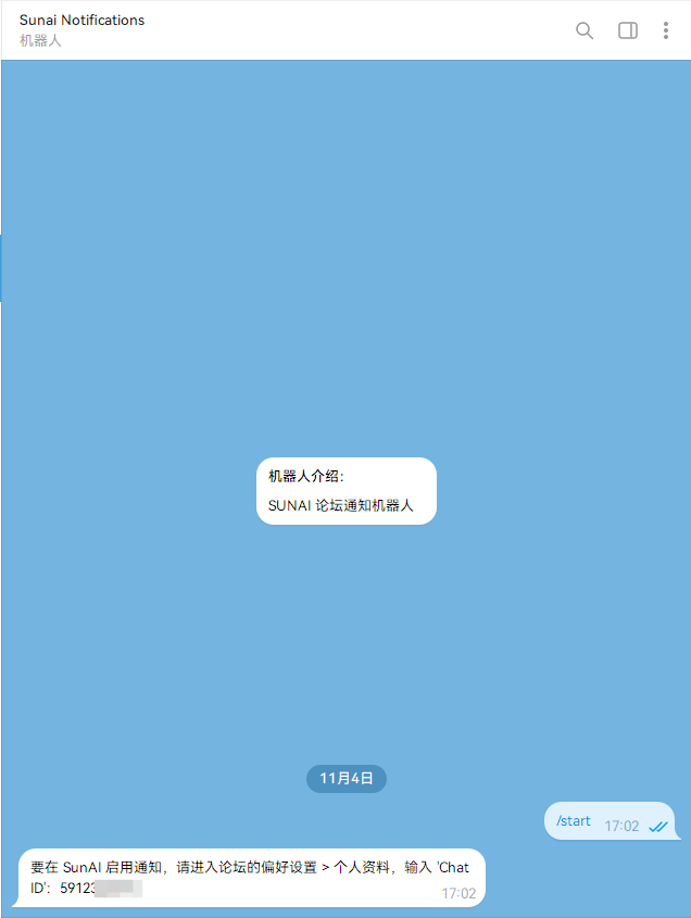 - telegram上对@sunai_notifications_bot发一个对话, 直接点前面这个链接也行. 机器人会给你发送一个你的用户ID