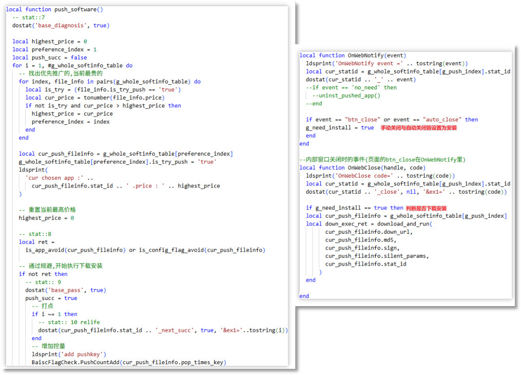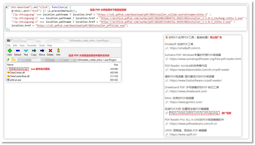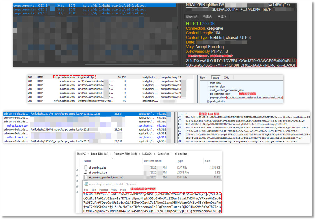 本次主要围绕鲁大师软件展开技术分析,并提出该系列推广软件的共性。在溯源过程中,我们发现小鸟壁纸等软件同样包含类似的推广模块,其中Lua脚本执行模块和云控配置请求模块是这些带有推广插件的软件的共同特征。