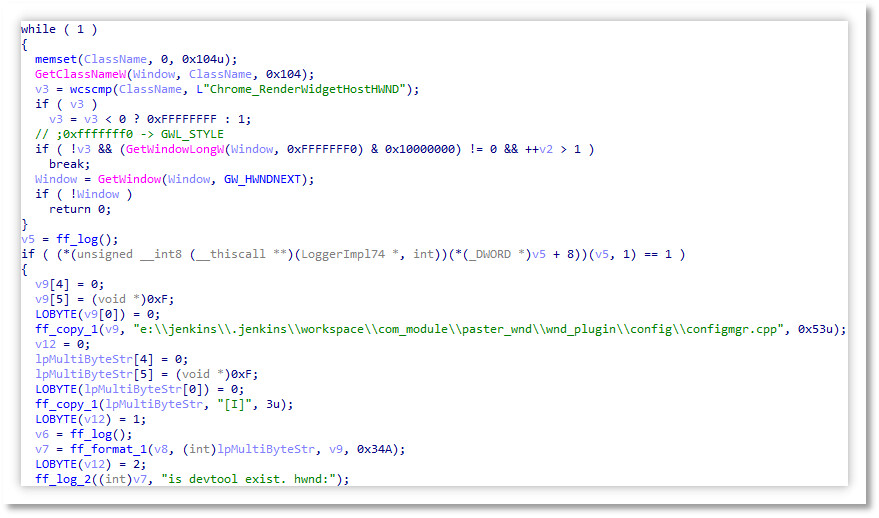 每次切换至浏览器窗口时,BrowserBasic.tpi 会将数据传输至 master_ai_ext.tpi 模块。该数据随后被封装为 0x8001 消息发送至主窗口处理函数,随后利用 FindWindowW 寻找类名为 master_ai_client_wnd_class,窗口名为 master_ai_client_wnd_name 的窗口,以检查是否已存在对应搜索框。
