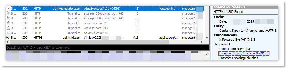 还有京东和其他网址会通过 http://dg.fireemulator.com/dcp/browser/rc,获取重定向链接,即为京粉佣金推广链接。