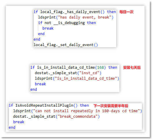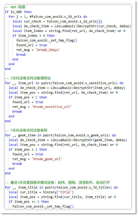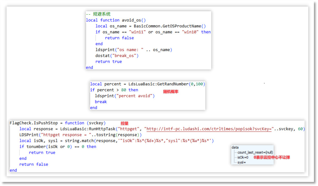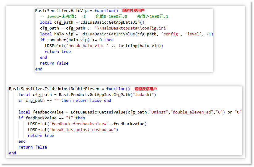 为了防止其具有争议性的推广行为被技术人员分析发现、被公众舆论讨论揭露,躲避自动化分析软件的监控和拦截,隐藏背后编织的巨型利益输送网络,这些推广模块采用了多种技术对抗手段。它们通过云控配置实时调整自身行为,专门规避技术人员等高危群体,精准针对普通用户投放。推广模块会根据用户的 系统环境、地理位置、使用时长、是否充值 等多维度信息判断用户价值,仅对"安全"目标、"小白"用户启动推广行为,使推广行为更加隐蔽。