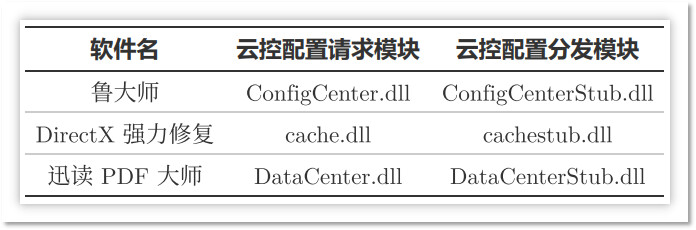 不同软件中的云控配置请求模块名称各异,但功能相同。例如: