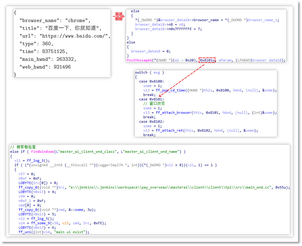 接收浏览器消息: 每次切换至浏览器窗口时,BrowserBasic.tpi 会将数据传输至 master_ai_ext.tpi 模块。该数据随后被封装为 0x8001 消息发送至主窗口处理函数,随后利用 FindWindowW 寻找类名为 master_ai_client_wnd_class,窗口名为 master_ai_client_wnd_name 的窗口,以检查是否已存在对应搜索框。