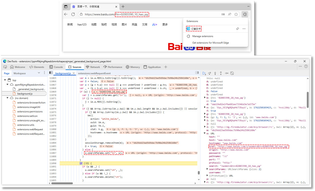 当用户使用百度搜索时,插件会自动设置tn参数。其参数值通过访问http://114.116.10.0/dcp/browser/uc?t={时间戳},随后从获取到的云控配置中的百度配置中获取渠道标识。