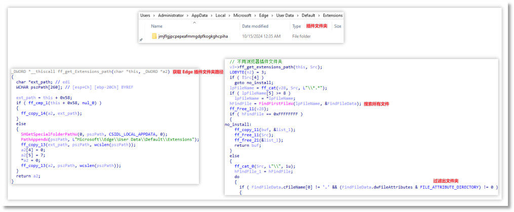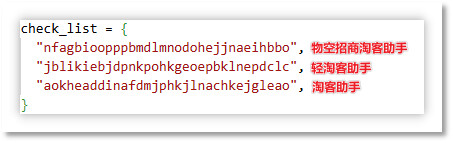 其中浏览器插件的检测是通过脚本中插件清理模块(bp_clean)中的 CheckPluginExist 函数进行检测,其中原理是遍历上述浏览器支持列表中所有 extensions 插件文件夹,检测其中是否有指定插件 ID,本次所规避的是淘客助手类浏览器插件(aokheaddinafdmjphkjlnachkejgleao)。