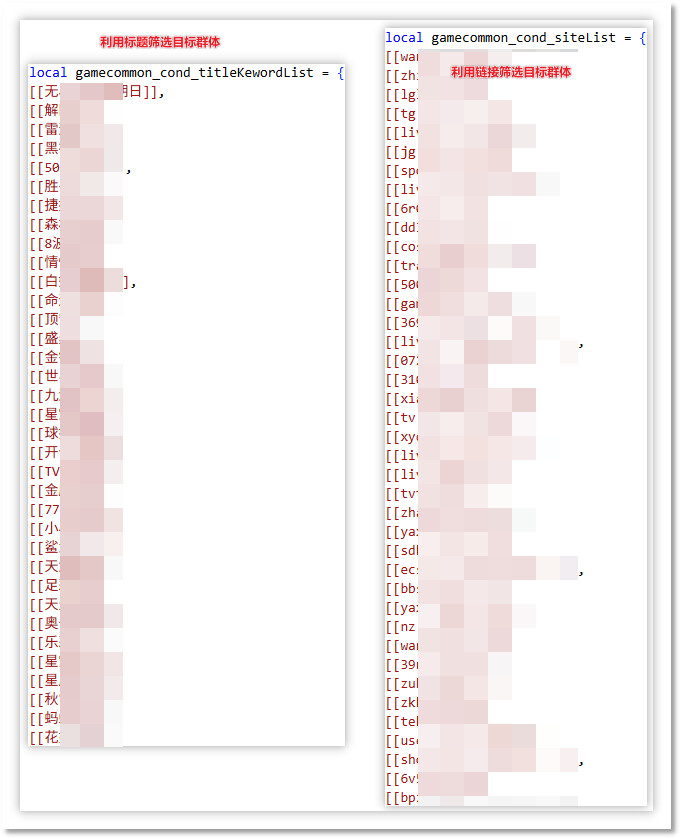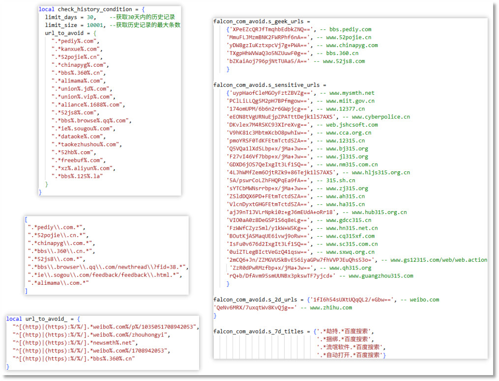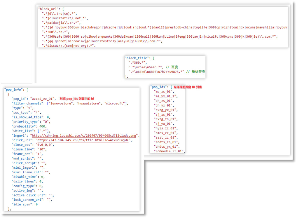 下图为云控配置中出现的 black_url 与 black_title 字段,根据其命名及所列网址和标题内容,推测是禁止弹窗的页面。且云控配置中的 pop_ids 为允许弹窗的ID列表,与 pop_info 中的 pop_id 相对应。