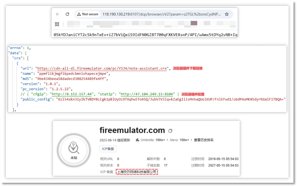 随后发送http://118.190.130.219:8107/dcp/browser/cV2?param=加密({"i":"60D2984F-487F-429d-B3F8-62E76030699E","p":"hvsLi6Wy","s":0,"t":1762314116,"v":"1.2.5.22"}) 获取插件数据,其中字段 p 的值决定所获取的云控配置,当值为 hvsLi6Wy 时,返回数据中插件下载地址所属域名的备案信息为“上海灸烈网络科技有限公司”。