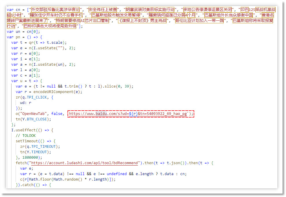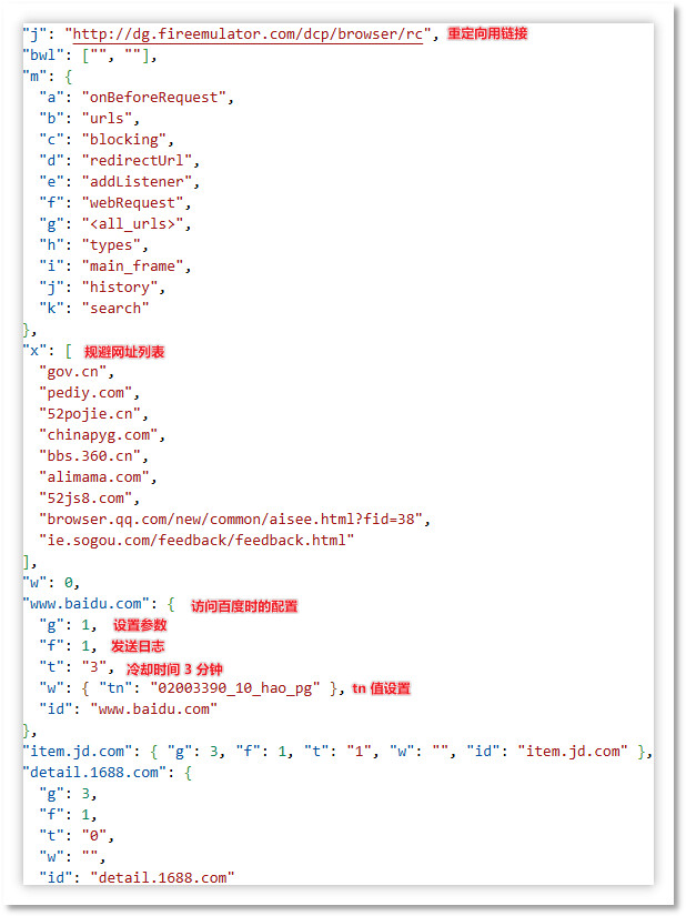 根据测试中获取到的云控配置,推广模块会进行多种流量劫持操作。例如,识别到用户访问京东链接时会额外跳转至红包领取页面以获取推广佣金;识别百度搜索链接时会在URL中添加 tn 渠道标识参数以获取搜索推广分成;以及其他类似的流量劫持变现行为。