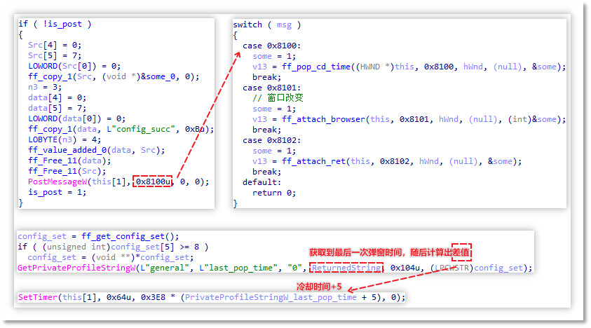 云控配置触发冷却时间检测: 从 ConfigCenter 获取到云控配置后,其会发送 0x8100 消息以触发检测冷却时间,随后通过 SetTimer 设置 ID 为 0x64 的计时器等待冷却结束,最后执行环境规避检测。