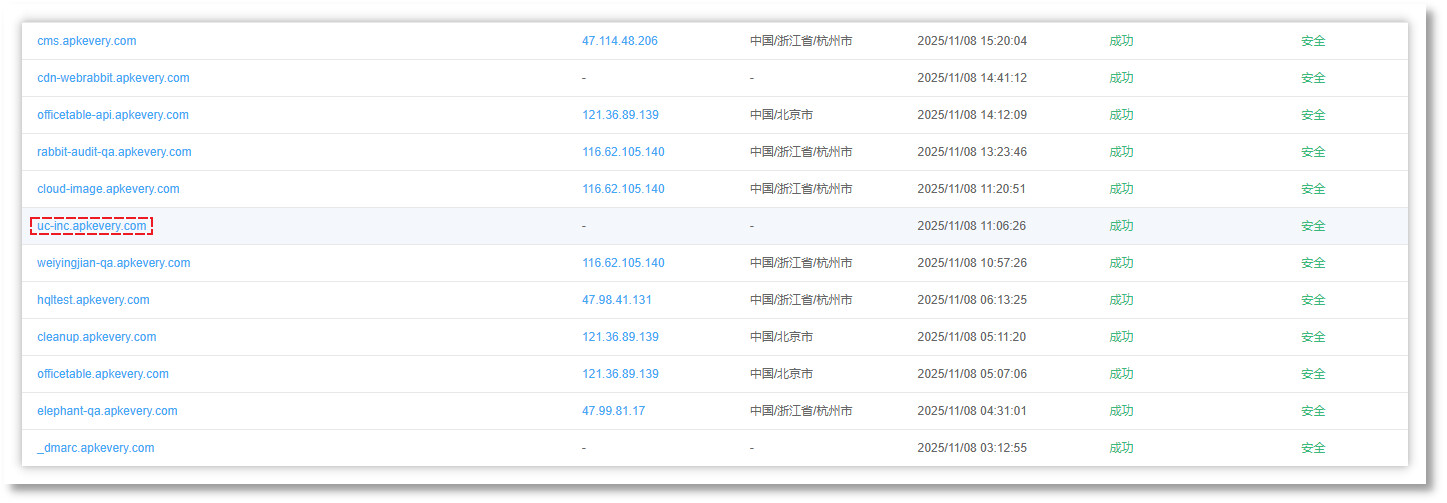 在收集本次威胁情报相关信息的过程中,我们发现了一系列相关的网络活动痕迹。其中,围绕"天津杏仁桉科技有限公司及其域名"apkevery.com",产生了大量网络活跃数据。