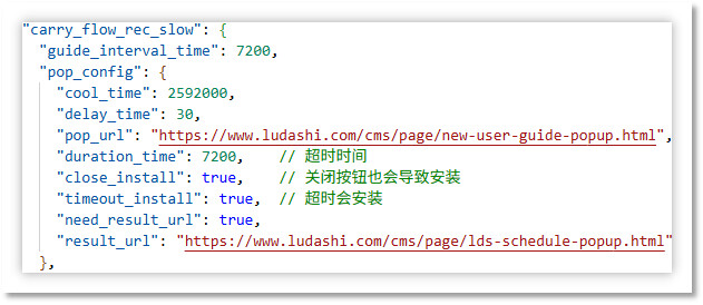 云控配置: 下图为整体云控配置中的弹窗安装相关配置,其中包含 close_install、timeout_install 之类的安装开关,分别为是否允许点击关闭按钮安装和超时安装。
