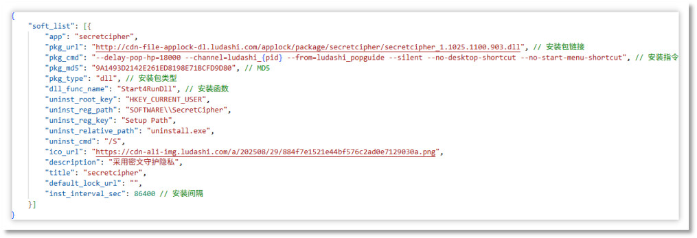 安装前先随机选择目标软件,并下载该安装包(动态链接库)并调用导出函数 Start4RunDll,以实现安装。安装时会附加静默参数 --delay-pop-hp=18000 --channel=ludashi_ludashi --from=ludashi_popguide --silent --no-desktop-shortcut --no-start-menu-shortcut,此时安装是静默的、没有托盘图标、开始菜单、桌面快捷方式等显式安装效果。