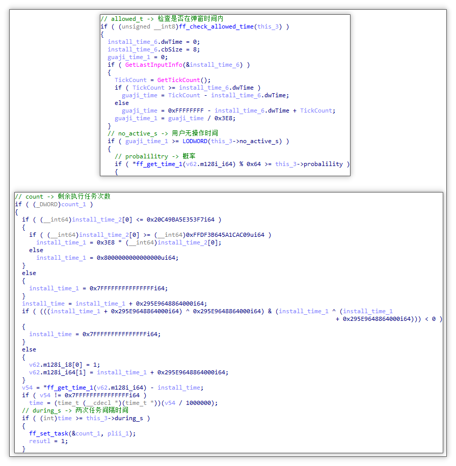 1. 首先,读取 HKEY_CURRENT_USER\SOFTWARE\SystemTask 项中的 task__{allowed_p} 键。若该键存在,则读取其中的 let_{上次任务执行时间} 和 remain_{剩余任务执行次数},以供后续检测使用。