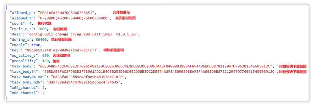 任务信息保存至注册表: 首先会将云端配置中的七个关键参数以下划线的方式连接:task_body_md5、version、durings_s、cycle_c_s、count、probalility、no_active_s,对它们进行MD5 哈希计算,得出 MD5 值。随后再将 allowed_p、MD5 值、let_{当前时间}、during_{durings}、remain_{剩余任务执行次数}(该值每次任务执行时都减 1)通过分号连接,并将该字符串写入至注册表 HKEY_CURRENT_USER\SOFTWARE\SystemTask 项 task__{allowed_p} 键中。