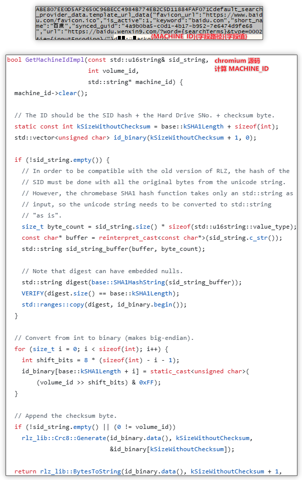 4. 以 {MACHINE_ID}{字段路径}{字段值} 的形式组合并计算其 HMAC-SHA256 哈希值,使用的密钥为 e748f336d85ea5f9dcdf25d8f347a65b4cdf667600f02df6724a2af18a212d26b788a25086910cf3a90313696871f3dc05823730c91df8ba5c4fd9c884b505a8,该密钥为固定值。