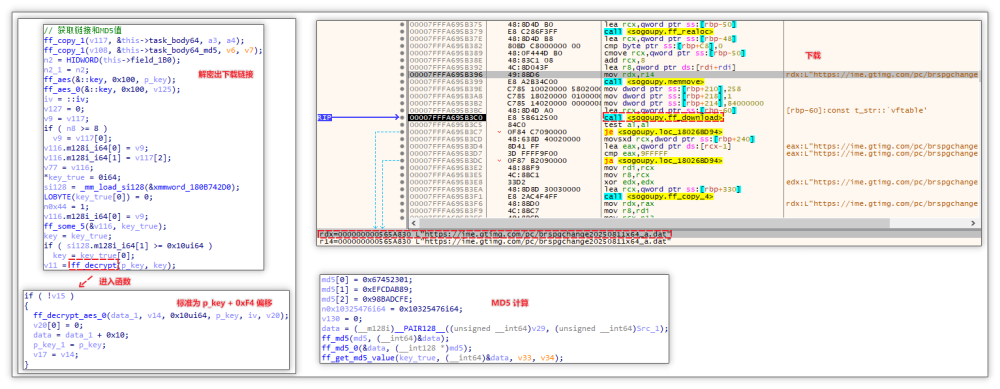 下载推广模块: 任务开始后首先解密 task_body64 字段值(该解密算法采用的是 AES 算法并搭配非标准密钥流),获取到下载链接https://ime.gtimg.com/pc/brspgchange20250811x64\_a.dat 并开始下载,下载完毕后,运用 MD5 算法计算所得 MD5 值,并与 task_body_md5 进行比对,以确认二者是否一致。