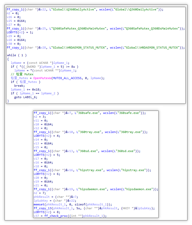 检测并规避杀毒软件: 借助函数OpenMutexW 与 Process32NextW 检测本计算机中是否存在360或火绒的互斥体、进程名,若不存在则继续推广。