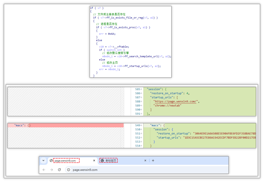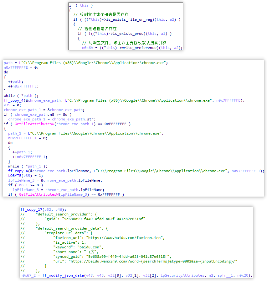 其推广模块会首先检测用户设备上的杀毒软件,随后通过篡改配置文件的方式,强制修改 Edge 与 Chrome 两款主流浏览器的主页及默认搜索引擎设置。目前,火绒安全产品可对上述推广模块进行拦截与查杀。