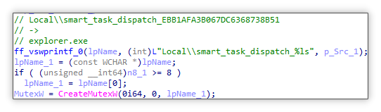 为了防止多次运行,它会创建互斥体 Local\\smart_task_dispatch_{被加密的进程名}。